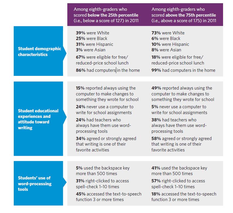 Despite concerns that the digital medium would penalize students that did not have regular access to computers, the patterns of differences between pen-and-paper assessments and computer-based assessments seem to stay consistent. The computer does not seem to penalize or give advantage to any one group compared to another, and higher-achieving students seem to do better on writing assessments whether or not they are computer-based.