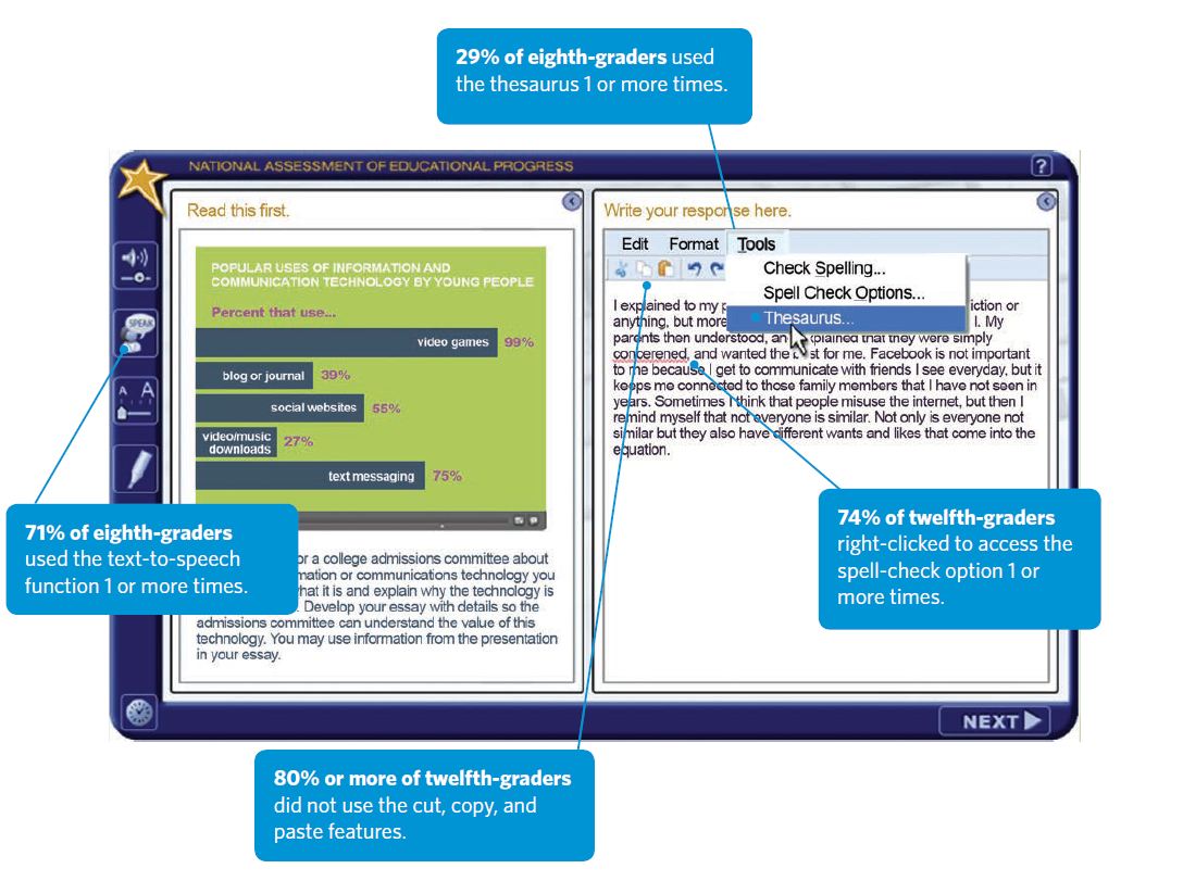 Scoring guides were developed for human scorers and the assessments were graded as rough drafts. Students were allowed some basic formatting and editing tools, such as backspace, cut, copy, paste, bold, spell-check, and thesaurus. Results came across in three achievement levels: Basic, Proficient, and Advanced, with 75% of 8th and 12th grade students performing at or above the Basic achievement level.